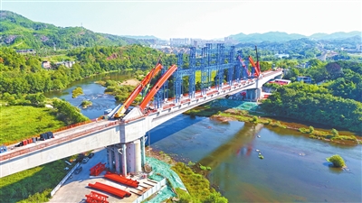 9月15日,在会昌县麻州镇瑞梅铁路湘水特大桥160米连续梁系杆拱施工现场,工作人员正有序进行拱肋吊装作业。瑞梅铁路湘水特大桥全长2820.3米,其中,52号至53号墩的160米连续梁系杆拱,是瑞梅铁路全线跨度最大系杆拱,也是瑞梅铁路重难点控制性工程。通讯员 华辛明摄