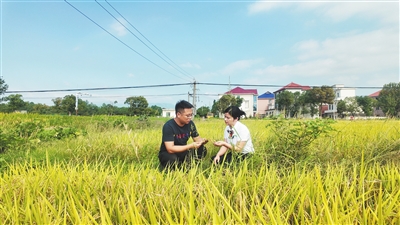 安义农商银行客户经理深入水稻专业合作社承包的稻田了解丰收情况。