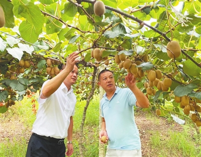 奉新农商银行工作人员现场调查猕猴桃挂果采摘情况。