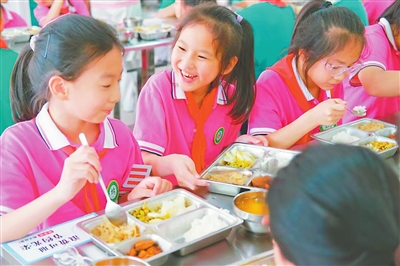 站前路学校教育集团云海路校区的孩子们在享用午餐。 本报全媒体记者 蔡颖辉摄