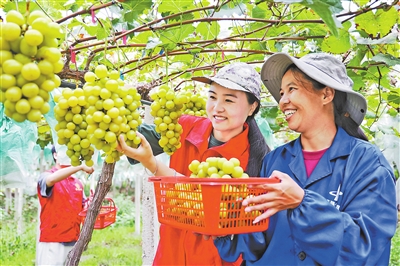 9月18日,芦溪县新泉乡党员干部来到新泉村魅力水果种植基地,帮助果农采摘葡萄。