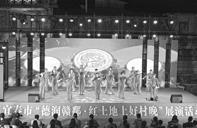 9月23日,在全国文明村——宜丰县芳溪镇下屋村,以“满村欢歌颂文明”为主题的“村晚”精彩上演,村民欢聚一堂,载歌载舞共叙乡情。 特约通讯员 王紫艺摄