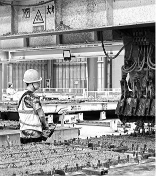10月10日,赣江新区装配式建筑生产基地内,工人正在操作智能化设备进行混凝土振捣作业。该基地由赣江控股集团等投资建设,集研发设计、构件生产、产学研合作于一体。