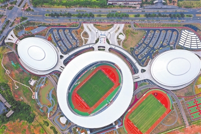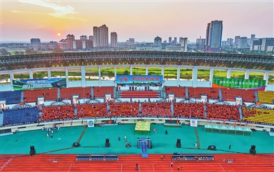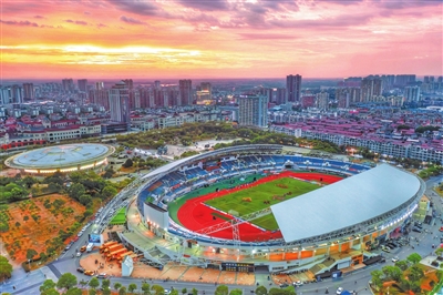 9月28日,夕阳的柔光为樟树市全民健身中心体育场披上了一层金色的外衣。
