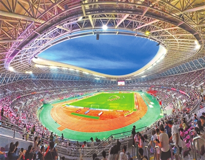 7月25日傍晚,鹰潭市体育中心体育场上空晚霞漫天,染红了场馆,更点燃了球迷热情。