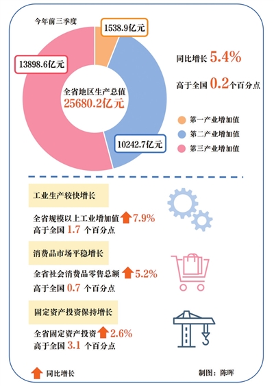“总的来看,前三季度稳就业稳经济政策举措接续发力,全省经济保持平稳增长态势,高质量发展扎实推进。”省统计局副局长喻滨介绍,全省上下全力拼经济、稳增长、促发展,主要经济指标好于预期。前三季度,全省GDP同比增长5.4%,高于全国0.2个百分点,高于上年同期0.7个百分点;其他主要经济指标增速均高于全国,规模以上工业增加值、社会消费品零售总额、固定资产投资同比分别增长7.9%、5.2%、2.6%,分别高于全国1.7、0.7、3.1个百分点。