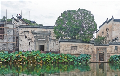 婺源县充分挖掘徽派建筑与历史人文底蕴,打造沉浸式历史文化街区。图为近日,在位于紫阳镇的弦高古城西湖凼,工人在加紧修复徽派建筑房屋。