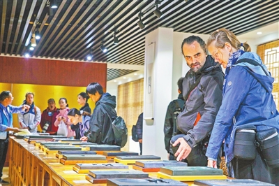 10月20日,庐山市秀峰景区,外国游客在金星砚文化博物馆内参观。庐山市积极探索文旅融合,将优秀传统文化的挖掘、保护和传承与发展融入文化旅游产业中,有效促进文旅消费。特约通讯员 韩俊烜摄