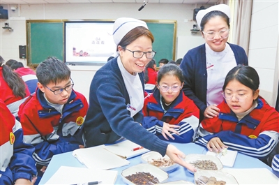 图②:10月22日,在河南省洛阳市汝阳县城关镇第三初级中学,县中医院医务人员给同学们讲解中药种类和功能。