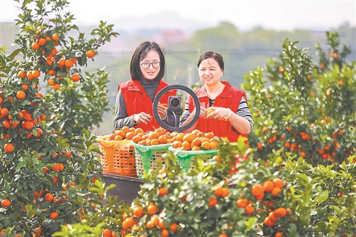 近年来,湖口县张青乡荷塘村大力发展特色村级集体产业,采取“合作社+农户+基地”模式,盘活土地资源,带动村民增收致富。图为11月13日,荷塘村蜜橘园开园,志愿服务队队员正在进行直播带货。特约通讯员 张 玉摄