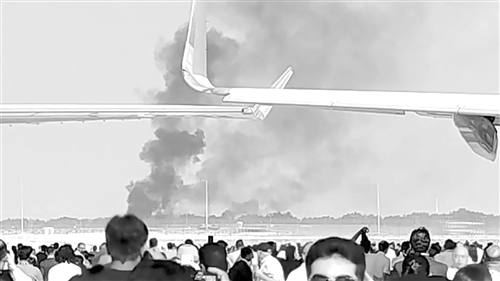 11月21日,在阿联酋迪拜,战机坠毁现场冒出滚滚浓烟。阿联酋国防部当日发表声明说,一架印度战机当天在迪拜航展进行飞行表演时坠毁,飞行员已确认遇难。 新华社发