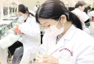 口腔医学专业学生在仿真头模实训室练习口内操作