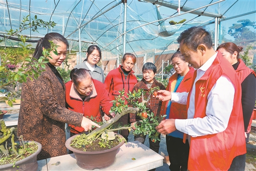 “修路要齐心,致富要抱团。”许多村民在茶社讨论起在家门口致富的法子。2019年,朱迪如牵头成立友邻盆景种养专业合作社,带着30余户村民把盆栽种植做成了特色产业。发展至今合作社已经有盆栽1万余盆,年收入超200万元。培训园内,朱迪如一边亲手给金弹子盆景蟠扎塑形,一边细致讲解,从修剪技巧到养护要点,把经验毫无保留地传授给学员。
