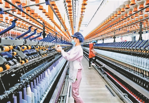 在江西卫棉纺织集团有限公司生产车间里,工人忙着加工棉纺产品。依托邮储银行于都县支行3500万元“科创信用贷”支持,企业打造“5G+智慧车间与循环再生”生产线。(于都县金融服务中心供图)