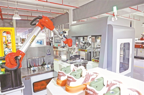 石城县的新旭晖鞋业发展有限公司车间内,生产线上机械臂飞速运转。该公司坚持数字化驱动企业创新发展,打造现代化智能工厂。通讯员 温京燕摄
