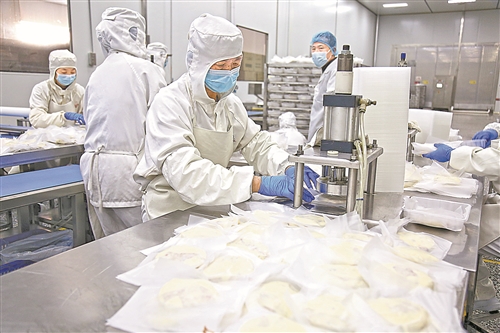 11月25日,在位于石城县小松绿色产业园的江西大由大食品科技有限公司智能工厂内,工人正赶制订单。目前,该公司各条生产线正满负荷运转,加紧生产手抓饼、安格斯牛肉馅饼等产品,全力保障年底市场供应。刘新权摄