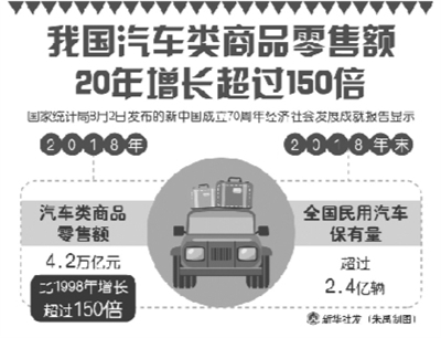 我国汽车类商品零售额20年增长超过150倍