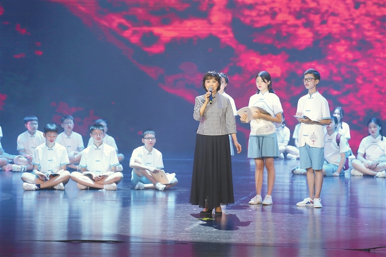 7月25日晚,著名表演艺术家朱琳在表演情景诵读《匆匆》。当日,“诗意中国 书香宜春”2019年郑谷草堂诗词夏令营诗词朗诵音乐会在宜春举行,乔榛、李双江、董浩等众多艺术名家与学生们同台诵读古典诗词。本报记者 邹海斌摄