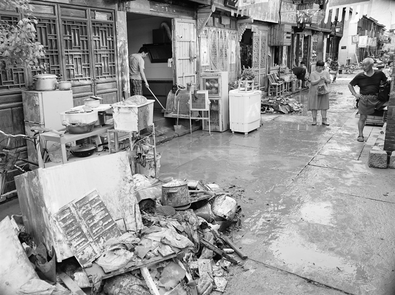 受超强台风“利奇马”影响,浙江临海老城区内有着1600多年历史的台州府古城墙遭受洪水围困,有关部门和各方救援力量正尽全力抢险救灾。记者在现场看到,目前城内洪水已基本退去,老城居民正展开生产自救,清理淤泥和垃圾,恢复生产生活秩序。 新华社记者 翁忻旸摄