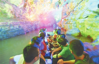 8月8日,游客在彭泽县龙宫洞景区游览。在灯光和水的映衬下,洞内呈现出五彩缤纷、如梦似幻的景象。本报记者 周 霖摄