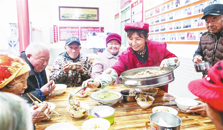 | ▲12月18日,龚桂连等老人在丰城市尚庄街道建设社区星垣村小组幸福食堂用餐。在党建“三化”创建过程中,该街道发现部分留守老人一日三餐无人照料。于是,按照“政府主管、村级管理、村民自愿、非盈利性”的原则,建成了24家幸福食堂,每个食堂投入4万元建设奖补资金,老人每月只需交200元至300元就能解决一日三餐。目前,幸福食堂已惠及426名老人。本报记者 梁振堂摄 |