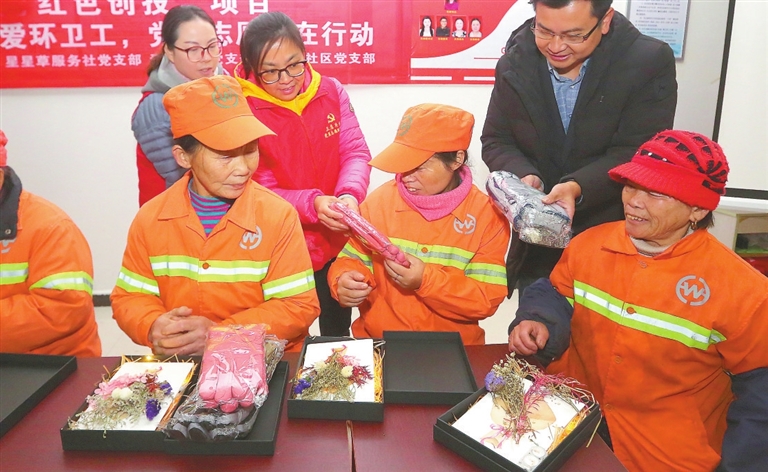 | ◀12月19日,环卫工人在南昌市青云谱区三店北社区党支部工作室休息,并试戴暖手套。当天,青云谱区星星草服务社组织爱心志愿者启动“感恩有你 一路同行”关爱环卫工暖心活动。本报记者 海波摄 |