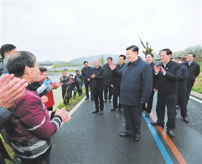 3月30日,习近平前往湖州市安吉县天荒坪镇余村村考察调研。2005年8月15日,时任浙江省委书记习近平在该村考察时首次提出“绿水青山就是金山银山”。15年来,余村坚定践行这一理念,走出了一条生态美、产业兴、百姓富的可持续发展之路,美丽乡村建设在余村变成了现实。在村党群服务中心,习近平详细了解余村发展情况,对他们发展绿色经济、带动村民增收致富的做法给予肯定。