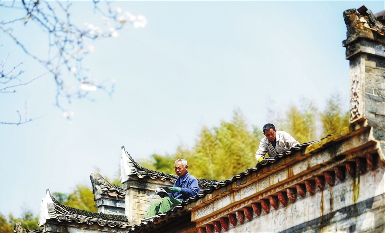3月20日,分宜县钤山镇石枫村枫溪古民居,建筑工人在屋顶盖瓦,进行抢救性修复。枫溪古民居是当地文物保护单位,距今有近两百年历史,因年久失修,受损严重,当地及时启动修复工程,“抢救”古民居,预计将于今年7月完工。