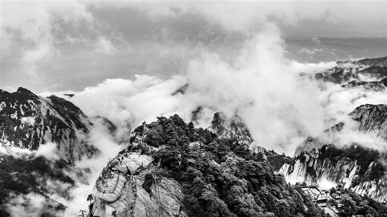 ▲9月20日,华山西峰笼罩在云雾中(无人机照片)。