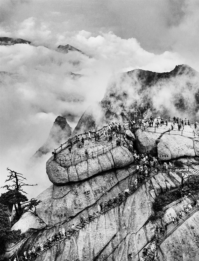 ◀9月20日,穿着雨衣的游客在攀登华山西峰青龙背(无人机照片)。 新华社记者 陶 明摄