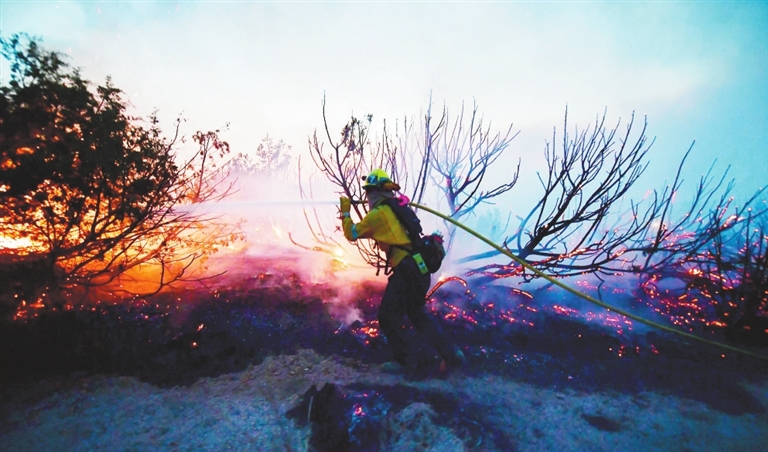 9月19日,消防员在美国加利福尼亚州参与灭火行动。美国西北部19日变得凉爽潮湿,有望助力消防员控制山火。不过,加州当天下午出现持续强风,加州南部山火进一步蔓延。 新华社/法新