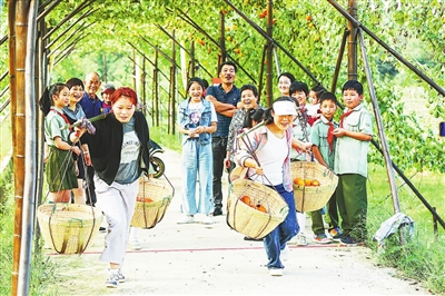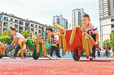 ▲9月21日,山东省烟台市福山区清洋街道中心幼儿园的小朋友进行“运送粮食”趣味比赛。