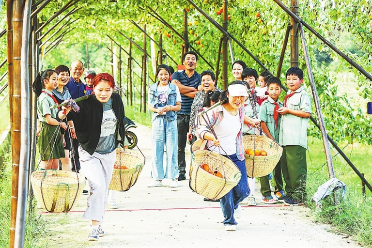 ▲9月20日,浙江省湖州市长兴县煤山镇东风村村民在农民运动会上参加“挑担进仓”项目比赛。