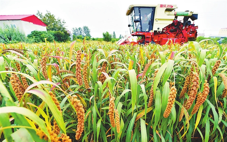 ◀9月21日,在河北省石家庄市藁城区南桥寨村,农民驾驶大型农机收割谷子。