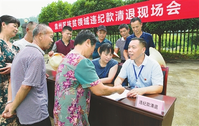 为切实加强扶贫资金监管,近日,宜春市袁州区渥江镇纪委、审计等部门,对近三年扶贫资金进行专项检查,共清退违纪资金1.5万元,并对5名相关责任人进行了处理。图为该区扶贫领域违纪款清退现场会。通讯员 江琴浪摄