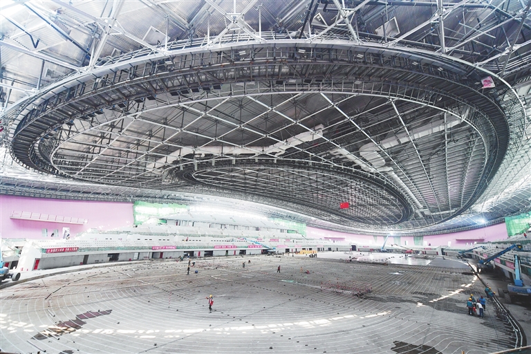 ▶工人在国家速滑馆“冰丝带”工地施工。新华社发