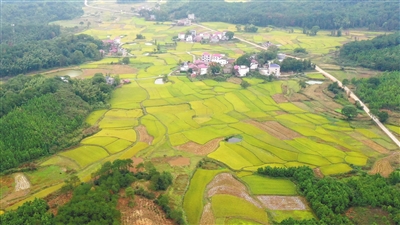 10月17日,鸟瞰安福县枫田镇万亩稻田,金色的稻田与村落勾画出一幅动人的金秋丰收图画,美不胜收。