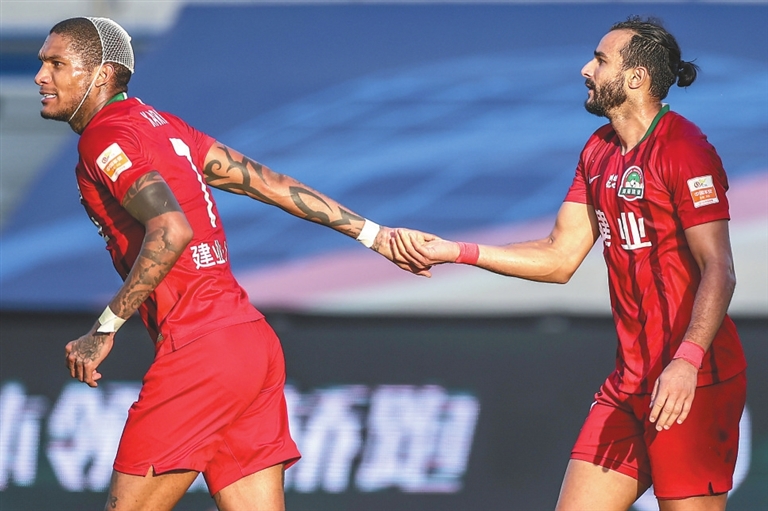 10月18日,河南建业队球员多拉多(右)进球后与队友庆祝。当日,在2020赛季中国足球协会超级联赛(大连赛区)第15轮比赛中,河南建业对阵武汉卓尔。新华社发