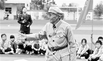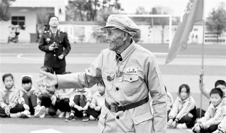 10月20日,乐平市众埠镇界首八一希望小学校园内,90岁的老英雄蒋昌水正在向学生讲述抗美援朝战场上不畏牺牲炸碉堡的故事。近日,乐平市人武部会同各乡镇、各中小学联合开展了老英雄进校园活动,“零距离”向广大师生宣讲抗美援朝保家卫国的爱国主义精神。