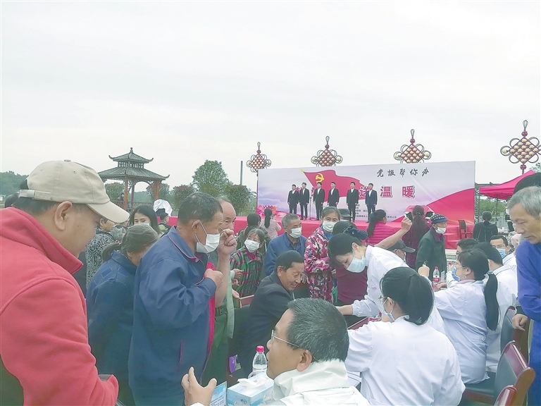 在广场两侧,一字排开的义诊台上摆放了血压、血糖、癌症筛查等检测仪器,来自省人民医院的10多名骨干医生开展义诊,村民们在家门口就享受到了专家级医疗服务。