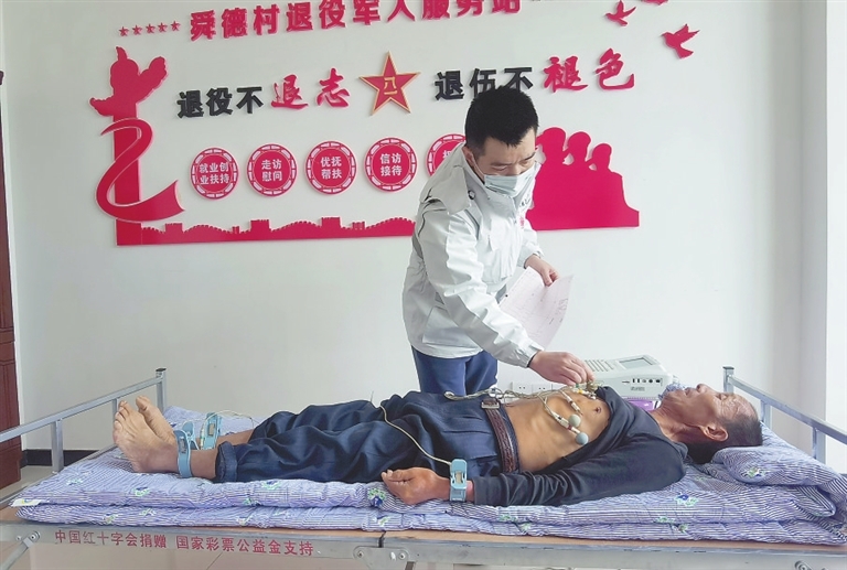 与村民广场一路之隔的舜德村党群服务中心二楼,临时搭建的心电图检测室一片忙碌,医生正依次在给10多名老人进行心电图检测。