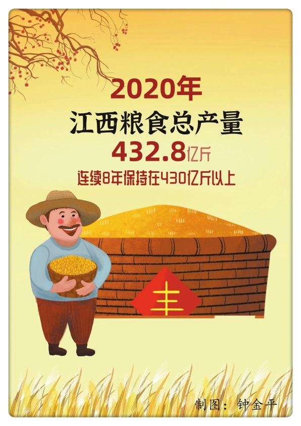 本报讯 (记者钟金平)12月10日,国家统计局公布2020年全国各地粮食生产情况,江西粮食总产量为432.8亿斤,比上年增加1.4亿斤。在疫情和洪灾不利影响下,我省粮食生产再获丰收,总产量连续8年保持在430亿斤以上。
