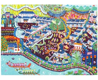 《万安民俗民宿农民画村》这幅作品,以画村丹青湖为画面主线,慢慢地向左横幅展开,首先映入眼帘的是画村标志性门牌以及错落有致的白墙青瓦“庐陵”建筑群。顺着长长的丹青湖往左,可观摩万安古老的龙舟赛,参观全国农民画精品展示馆,品味中国民间艺术盛宴。朝着鸭溪望去,就是我们的农民综合楼以及“画里人家”观光园。穿过观光长廊,就是小朋友的乐园——趣味石园,往右看是农民休闲长廊,这里青山绿水,一派田园风光。看完美景,往下就来到一排排农民画家漂亮住宅,这里的农民画家们,正在为家乡美景写生。还有那些快乐的村民们,在家门口跳起了“万安唱船”舞,唱起了“万安采茶戏”。