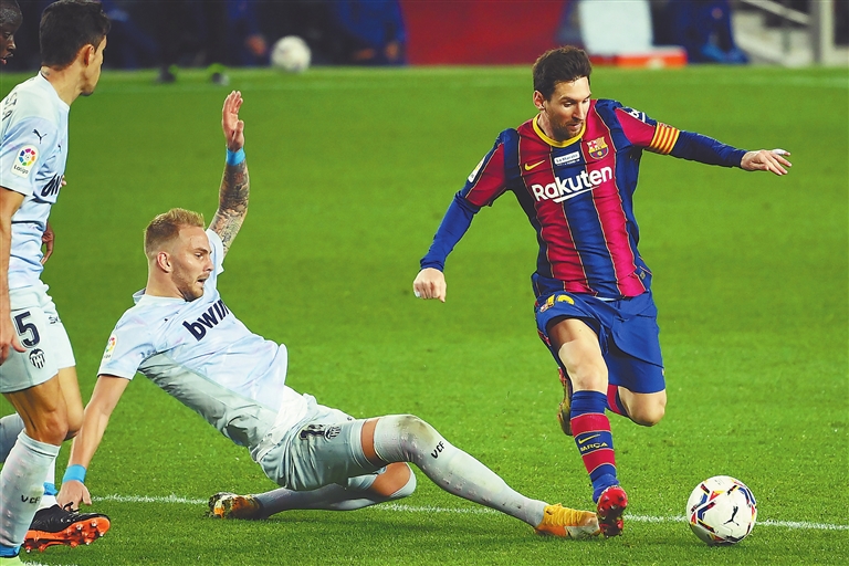 | ▲12月19日,巴塞罗那队球员梅西(右)带球进攻。当日,在西甲第14轮比赛中,巴塞罗那队主场以2∶2战平巴伦西亚队。梅西在上半场伤停补时最后时刻为巴萨攻入一球,并追平球王贝利保持的为单一俱乐部的进球世界纪录。