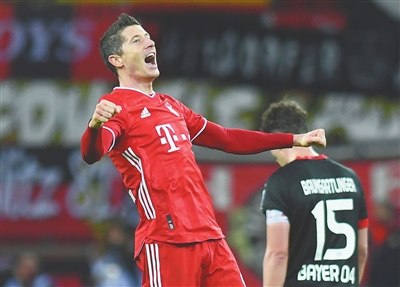| ▶12月19日,拜仁慕尼黑队球员莱万多夫斯基(左)进球后庆祝。两天前,莱万在2020国际足联(FIFA)年度颁奖典礼上获评“世界足球先生”。 当日,在德甲联赛第13轮比赛中,拜仁客场以2∶1战胜勒沃库森。新华社发 |