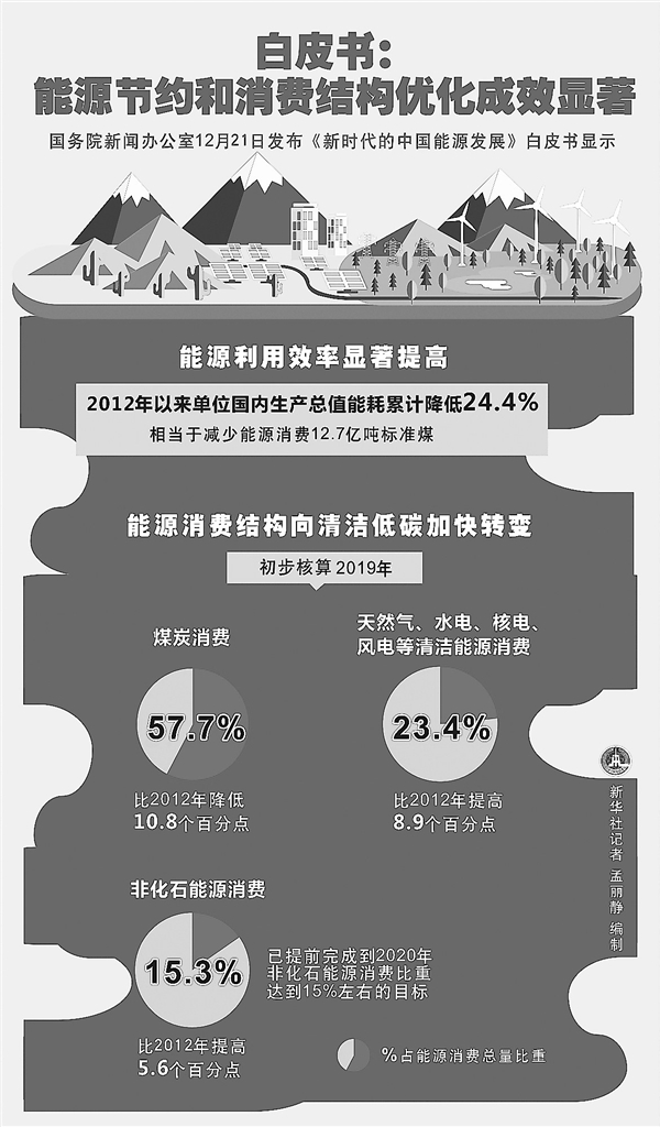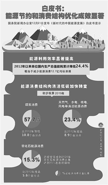 新华社北京12月21日电 (记者胡璐、刘羊旸)国务院新闻办公室21日发布《新时代的中国能源发展》白皮书显示,能源节约和消费结构优化成效显著。