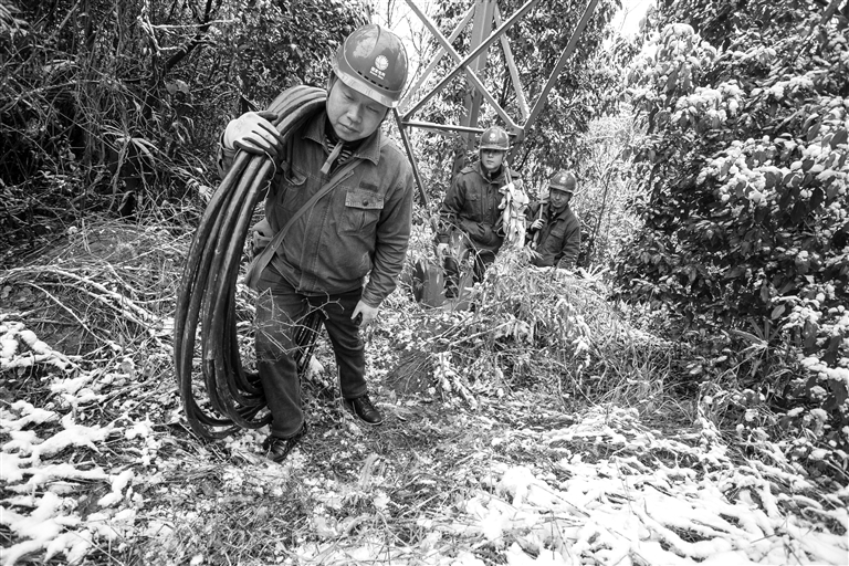 1月7日,国网瑞昌供电公司裕丰供电所员工正在该市10千伏安定湖线抢修线路。当日,瑞昌市普降大雪,为保证电网安全运行,国网瑞昌供电公司工作人员踩冰踏雪,对供电线路进行巡查和维护抢修,确保城乡居民正常用电。本报记者 曹诚平摄