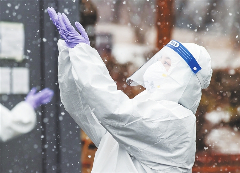 1月12日,韩国首尔一处新冠病毒检测站的工作人员在观赏雪花。受北极寒潮影响,韩国全境近日出现极寒天气。 新华社/路透