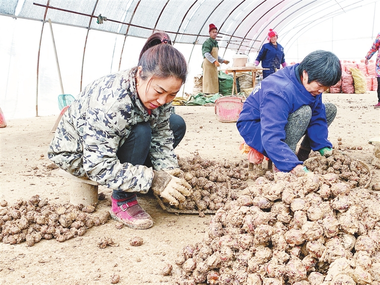 2020年12月17日,记者来到三江镇,正赶上马蹄大丰收。走进汗塘村付家村小组,村子里略显冷清,可不远处的田地里,却是一片火热场景。年轻的壮汉们负责翻地松土,年长的妇女们则忙着把嵌在泥土里的马蹄一个个挖出来。虽然双手被寒风吹得开裂,但是每挖出一个饱满的马蹄,她们的喜悦就写在脸上。而集镇上,则是另一番繁忙的景象——街道上车水马龙,道路两旁的店铺门口,人们三五成群地忙着对马蹄进行分拣、装袋,有客商前来订购,工人们便扛起一袋袋马蹄,装进大卡车,这些马蹄将被运往全国各地。