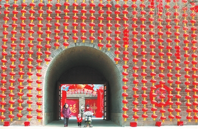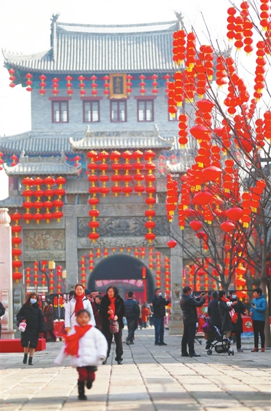 1月13日,游客在山东省青岛市即墨古城游览。随着春节临近,山东省青岛市即墨古城张灯结彩,洋溢着喜庆的年味。